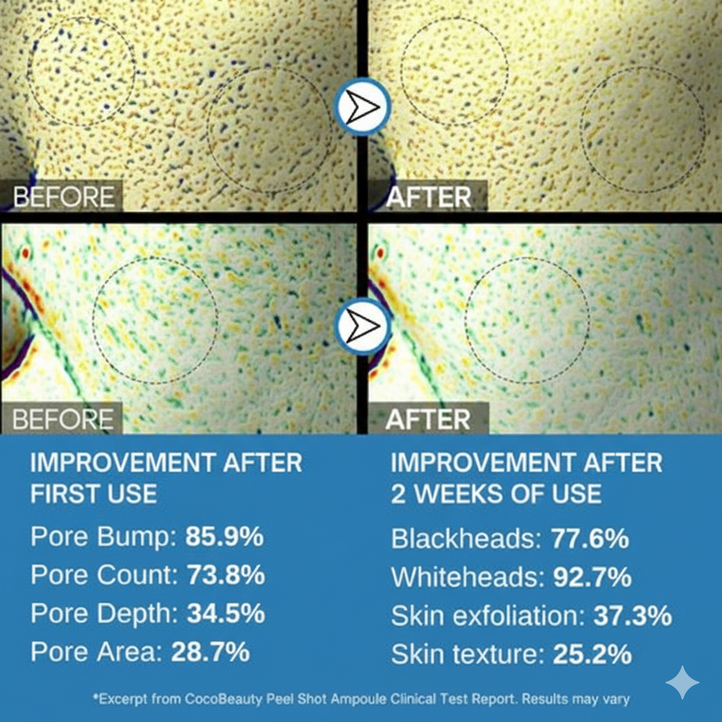 Watch your pores transform, day by day. Each time you apply CocoBeauty's Peel Shot Glow Rice Ampoule Duo, you're not just applying skincare—you're reclaiming confidence.