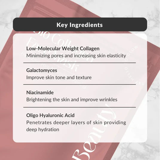 Infused with a potent blend of Low-Molecular Weight Collagen, Galactomyces, Oligo Hyaluronic Acid, and Niacinamide, our mask dives deep into your skin's structure, addressing problems at their root. These ingredients are not just mixed; they're curated based on leading scientific research and clinical trials that guarantee not just results, but a transformation.